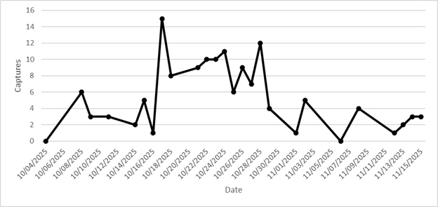 Fibure 1. Number of Northern Saw-whet Owls captured per night at the Harris Center for Conservation Education’s banding sites in the fall of 2025.