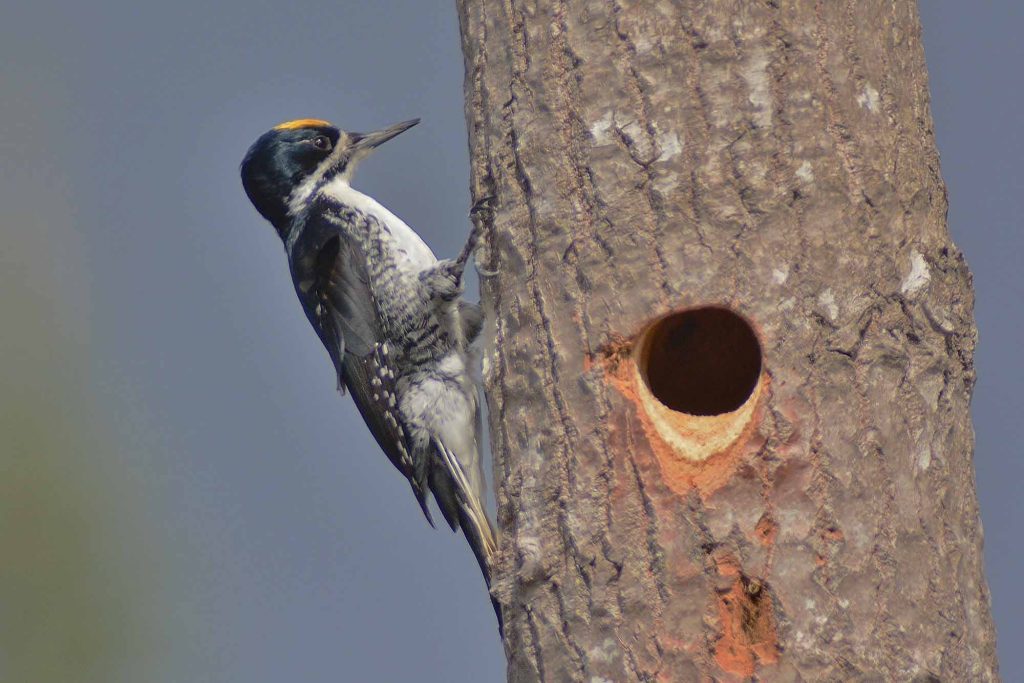 Nest cavities are almost perfectly circular and feature a distinctive 45-degree bevel at the bottom, both inside and outside. The diameter of the cavity trees can be surprisingly small. One cavity in a seven-inch-diameter tree near Little Cherry Pond made me worry it could break off in a windstorm. The BBWO generally does not reuse its nest cavities. I have found these cavities in black spruce, balsam fir, and balsam poplar, typically between 6 and 20 feet up the trunk. I’ve also discovered nest cavities in telephone poles along a busy road.