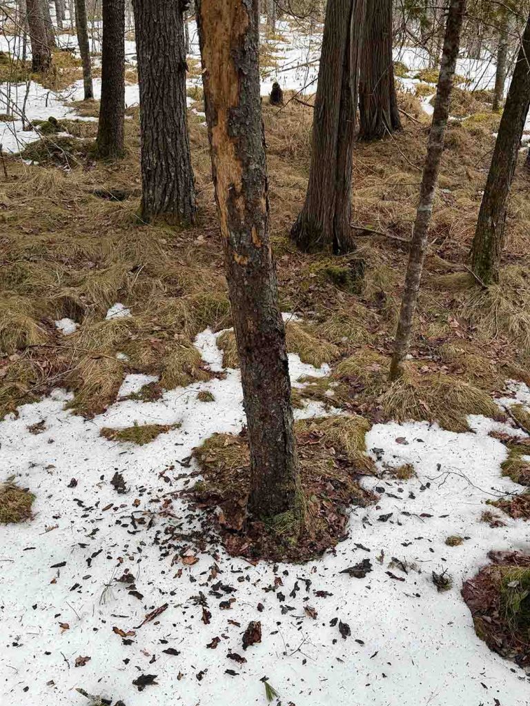 The BBWO is a bark forager. Look for piles of bark at the base of conifers where the BBWO has been flecking off bark searching for beetles. This is especially helpful in winter when snow covers the ground, and you may know the date of the last snowfall. Hairy Woodpeckers will also fleck bark. Both species will often come back to the same tree.