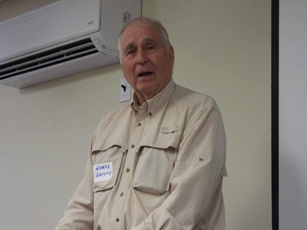 George Gavutis, Jr. has been a well-known birder in New Hampshire for many decades and has added significantly to bird research in the state. His contributions to the NH Breeding Bird Atlas included field work at Umbagog National Wildlife Refuge (NWR), where he spent many June days over the years. He noted that he was almost never home for Father’s Day! He is a long-term participant in the North American Breeding Bird Survey, as well as Christmas Bird Counts (CBCs). His column “Walk on the Wildlife Side” is a popular feature of the Kensington Community Newsletter. In September 2023, he was presented with the Goodhue-Elkins Award at the NH Audubon annual meeting. This award honors someone who has made outstanding contributions to the study of NH birds. Although George is no longer able to be quite as active outdoors, he continues to observe birds and record sightings from the observation room at the top of his house. From this vantage point, he can survey ponds, fields, and woods, all managed on his property for the birds. I had the privilege of interviewing him there, watching many birds come and go to the feeders as we talked.