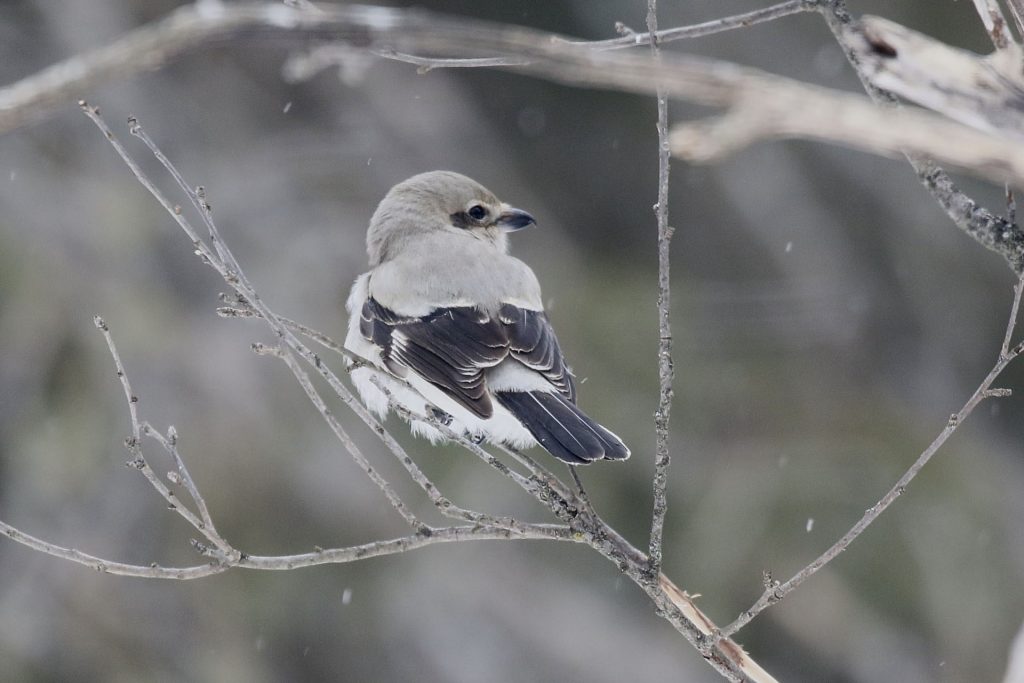The shrike had previously been seen grabbing mealworms from the feeders. I stopped and simply watched as it remained perched and waited. As I finished filling the feeders, the bird continued to observe me. I stood perfectly still while it looked around, flicked its tail, and then flew off into the woods.