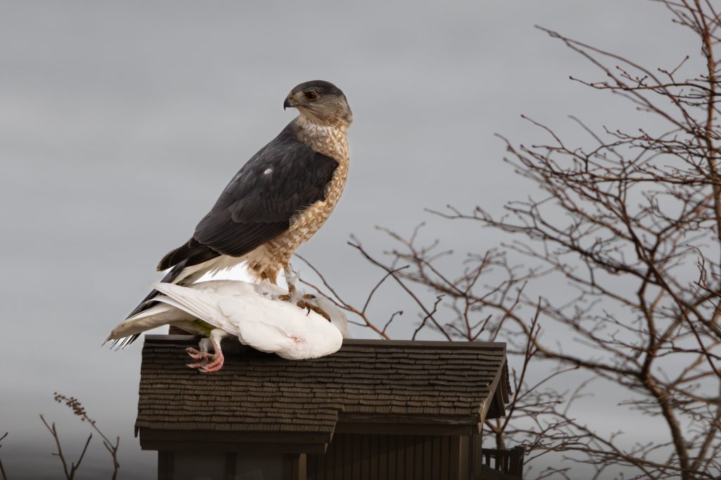 The Cooper’s Hawk pauses proudly for a few minutes on the roof of a birdhouse with its prey and then flies off.