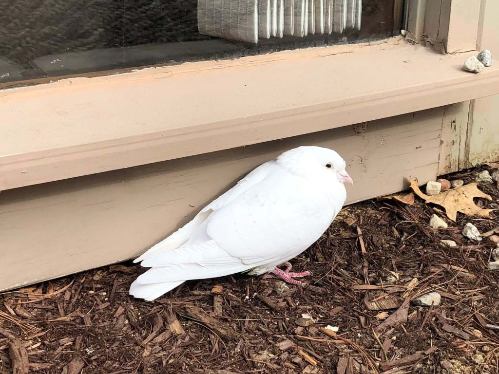 On March 13, I happened to be out in our front yard in Nottingham, when I noticed a white bird hovered near the entryway to the house. My first thought was “Is this a pigeon or a dove?” I went to find my husband Roger so he could take a photo and then figure out if the bird was injured and needed help.