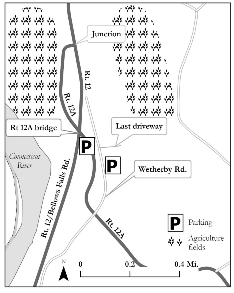 Wetherby Road is a small dead-end road off Route 12A (Langdon Road) in Charlestown. It’s a typical neighborhood road with a handful of residences near the entrance. As you go down the road it leaves the neighborhood setting and is surrounded by swampy and scrubby brush areas on either side. Just past the last driveway, the road turns into an unmaintained portion that runs into some cornfields before ending where it meets the active railway along Route 12. The good birding spots are in these scrub areas and cornfields.